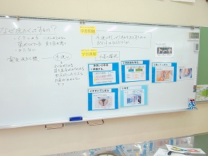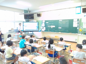 1年生は算数の学習でした。「どちらが多いか」ということを文章から読み取り式を立てて考える授業を行いました。