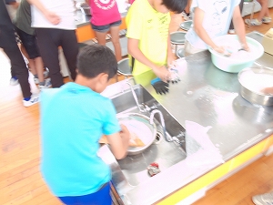 6年生は家庭科 単元「家庭生活」中の「衣服の手入れ」という学習内容でした。手洗いでしっかりと汚れを落とすためにはどんな点が大切かという学習を実際に手洗いをして確かめる場面を見ていただきました。