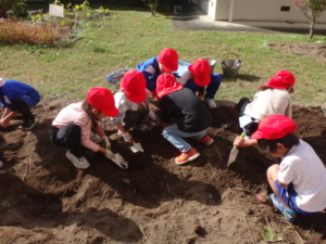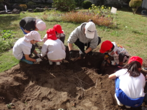 お芋を探せ(1年生) ふと中庭を見ると、1年生が先日サツマイモを掘っていた畑で作業しています。ちょっと覗きに行くと、「掘り残しがないかほってるの」と。スコップであちこち掘っていると、なんと大きな芋を発見。焼き芋にちょうどいいサイズ。宝探しのようでした。 ホームページ編集者2025-10-29T10:32:00+09:002025年 10月 24日|