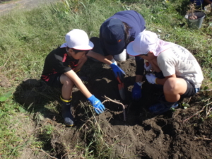 サツマイモ掘り(4年生) こちらも収穫の秋。4年生はサツマイモを収穫をしました。天候がよかったのかしっかり太った大きな芋がたくさん収穫できました。この芋を使って親子レクで焼いもをやります。傷をつけないようにと、仲間と協力して掘り進んでいました。どの子も真剣です。 ホームページ編集者2025-10-29T13:03:17+09:002025年 10月 9日|