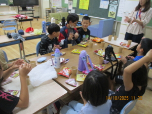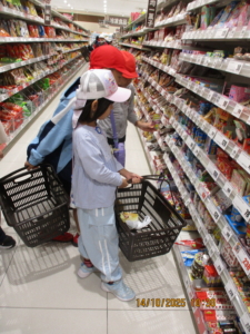 3組(特別支援学級)では、夏にキュウリの漬物販売で収入があり、それを元手に、お楽しみ会用のおやつを買いに行きました。所持金の範囲でどれだけ購入できるか値段を見て足し算しながらオーバーしないように選びました。思った以上にたくさん買うことができ、満足そうな笑顔が見られました。
