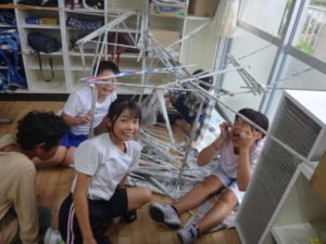 造形遊び(4年生) 図工の時間に、新聞紙をくるくる巻いて棒状にしたものを組み合わせて、造形遊びをしました。「何を作るか」でなく「何ができるか」。思いのまま、つなげて伸ばしてくっつけて。それぞれの思いがいろいろな形を作り上げていました。 ホームページ編集者2025-10-29T12:39:24+09:002025年 10月 14日|