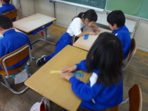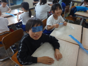 2年生は長さの学習を進めています。物差しを使って「測る」ことにも取り組むのですが、まずは長さの感覚をつかむため、「10cmはどれくらい?」と物差しを使わないで考えました。「自分の顔の縦」「親指と人差し指をL字にした間」「これ」などいろいろ意見が出て、実際にビニールひもで作ってみました。そのあと物差しで測ると…すてきな学びがありました。